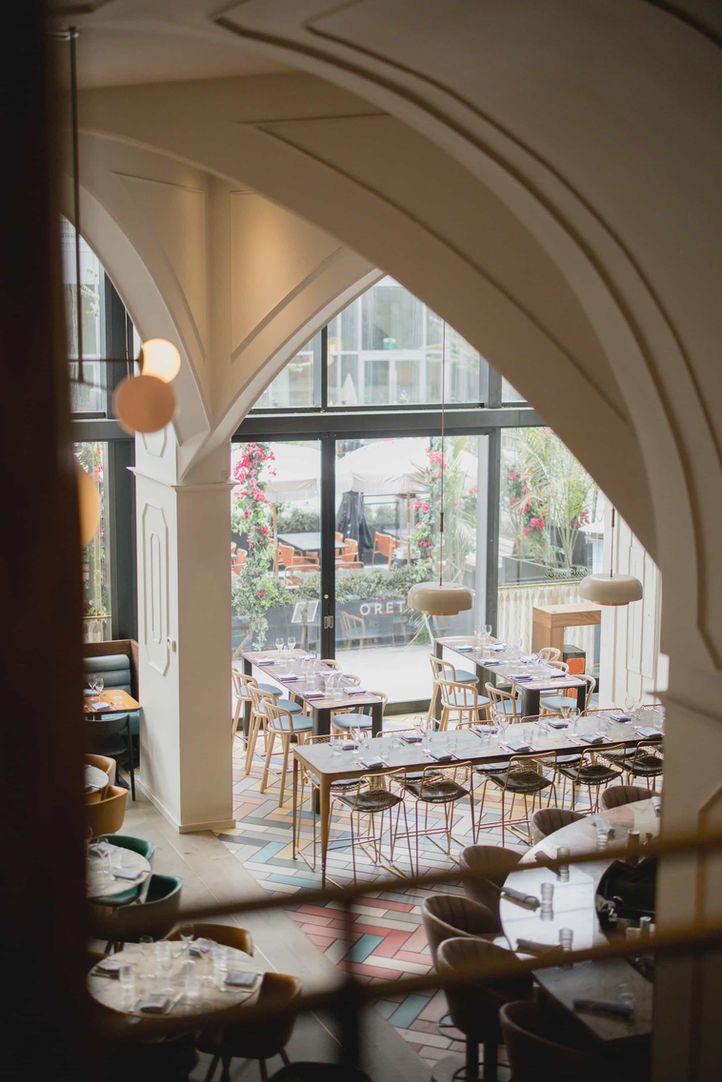 Oretta’s rooftop provides sweeping city views perfect for dramatic golden-hour couple portraits and editorial shots.